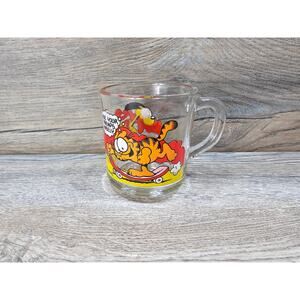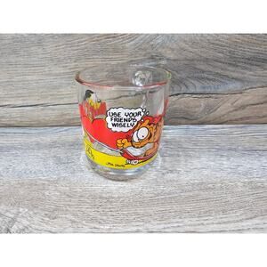Garfield Use Your Friends Wisely Glass Coffee Mug Cup 1978 Jim Davis. Condition is used, good clean used condition, no chipping or cracking. Measurements are 3" at base, 3" along top, 3.5" tall, weight is 10.5oz.