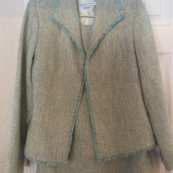 Beautiful tweed suit with accents of ice blue and pastel colors. Would be cute using blazer w jeans. Never worn!