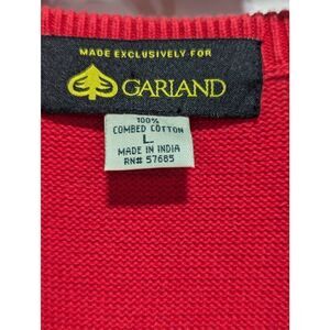 Introducing the Garland Men's Red Cotton Sleeveless V-Neck Sweater Knit Vest in Size Large. This classic vest combines timeless style with a touch of vintage charm. Crafted from soft, high-quality cotton, it features a rich red hue and a flattering V-neck design. Perfect for layering over shirts or under blazers, this versatile knit vest is ideal for those who appreciate vintage aesthetics and refined fashion. Elevate your wardrobe with this elegant piece from Garland.