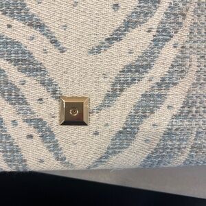 Megan’s love of texture is reflected in this Schumacher black and white embroidered fabric. The clutch is topped with a gold palm frond decorative hardware piece. The interior is lined with black linen, and contains accordion sides with grommets for an optional chain (this clutch does not come with a chain). Overall clutch dimensions are 12” x 7” with a magnetic snap closure.