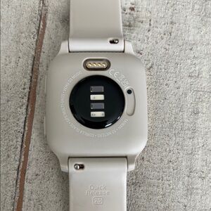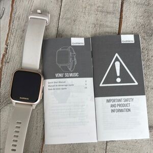 Garmin Venu SQ smartwatch with a rose gold bezel and gray band. Features GPS and music capabilities.