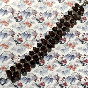 Bracelet is work in a garnet (dark reddish/pink toned) crystals. The actual design measures 6 1/2 inches with extended chain/toggle closure to fit 7-8+ inch wrist. Great costume jewelry piece to complete the look of that special outfit.