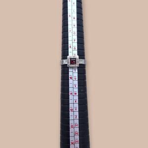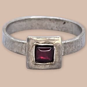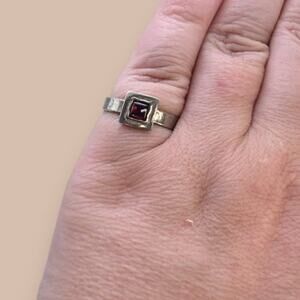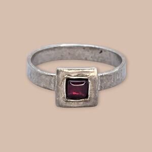 This striking sterling silver 925 ring features a genuine garnet gemstone, confirmed with a Presidium gemstone tester. The deep red cabochon is set in a bold square modernist bezel, giving the piece a refined yet handcrafted aesthetic.