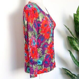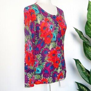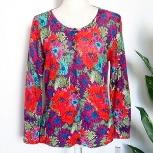 Garnet Hill 100% Merino Wool Multicolor Floral Knit Cardigan Sweater Size Small