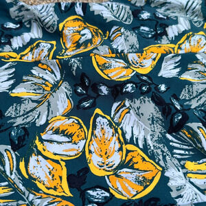 Beautiful, colorful print with shades of teal and golden leaves. Flattering details for a comfortable fit.
