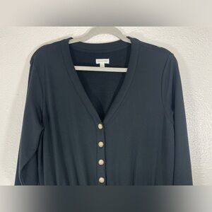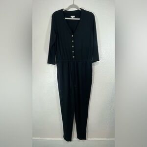 Garnet Hill Black Traverse Knit Jumpsuit Black Women’s Small. Has side pockets, waist drawstring tie, v-neck, half button down, thee quarter sleeves.