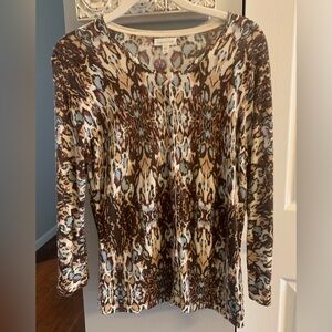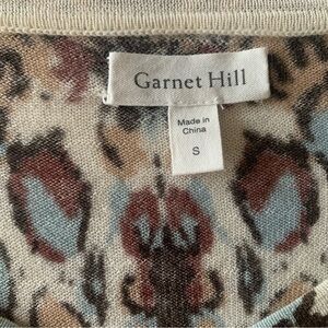 Elevate your style with this Garnet Hill women's lightweight cardigan featuring a bohemian pattern. The brown and cream and blue colors add a touch of elegance to any outfit. Perfect for both casual and formal occasions. Very nice pre-loved condition. (Model photo is stock)