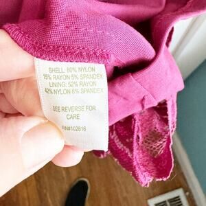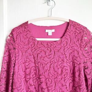 Garnet Hill Burgundy Lace Sheath Dress 3/4 Sleeve Scalloped Hemline Size 2 Classy Classic Preppy Party Event. Lace overlay. Scoop neckline. 3/4 sheer lace sleeves. Lining stops higher than lace overlay for interest to hemline. Super soft, heavy weight lining made of ponte-knit-style material. Good, preowned condition. Nylon/Spandex/Rayon. Hand wash.