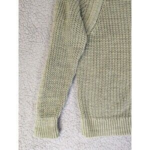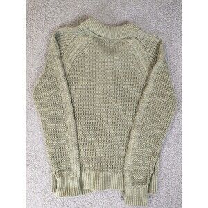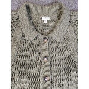 Beautiful heavyweight sweater with large round buttons. Color is a nice olive green. Made from an organic cotton and linen blend.