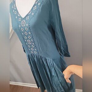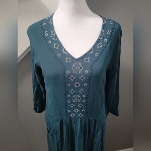 The Garnet Hill Teal Green Embroidered Dress in size 4 is a stylish and versatile piece perfect for various occasions such as travel, casual outings, and business meetings. This boho-inspired dress features a solid pattern with embroidered details, 3/4 raglan sleeves, and a crew neck neckline. Made from a comfortable cotton-spandex blend jersey fabric, this midi-length dress is lightweight, lined, and machine washable for easy care. The layered pleats and pockets add a touch of bohemian flair to this classic yet trendy shift and blouson style dress, making it a must-have for your wardrobe. This is in good preloved condition.