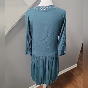 The Garnet Hill Teal Green Embroidered Dress in size 4 is a stylish and versatile piece perfect for various occasions such as travel, casual outings, and business meetings. This boho-inspired dress features a solid pattern with embroidered details, 3/4 raglan sleeves, and a crew neck neckline. Made from a comfortable cotton-spandex blend jersey fabric, this midi-length dress is lightweight, lined, and machine washable for easy care. The layered pleats and pockets add a touch of bohemian flair to this classic yet trendy shift and blouson style dress, making it a must-have for your wardrobe. This is in good preloved condition.