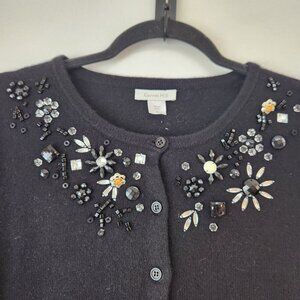 This is a classic cardigan from Garnet Hill in a beautiful and timeless black color with beading on top. Looks great worn unbuttoned, fully buttoned, or with some buttons, you can't go wrong! Perfect for a holiday or Christmas party, to wear to the office, or any event.