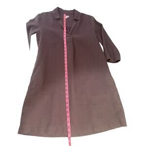A traditional collared shirt dress in 100% linen. A laid-back elegance in a popover silhouette. A dramatic front pleat. Garment washed for softness, relaxed fit, pull-on style, notched collar. 3/4 sleeves with cuffs, above knee length. Deep purple. Size 6. Please see photos for measurements.