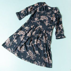 Garnet Hill Navy Blue Bohemian Pocket 3/4 Sleeve Pink Paisley Print Dress Sz 2