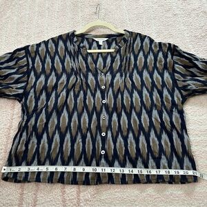 Chic button-down shirt with a striking ikat pattern. Features blue and brown hues. Button front. Cropped boxy fit. Short puff sleeves (elastic at sleeve hems) Pin tuck pleats at v neck.