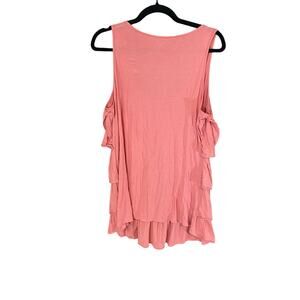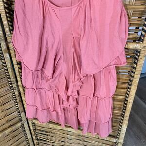 Garnet Hill women’s sleeveless tank top in a soft rose pink. Size Medium. Made in Peru from 100% Pima cotton for a luxuriously soft and breathable feel. Features layered ruffle detailing down the front and hem for a feminine, flowy look. Scoop neckline, pullover style.