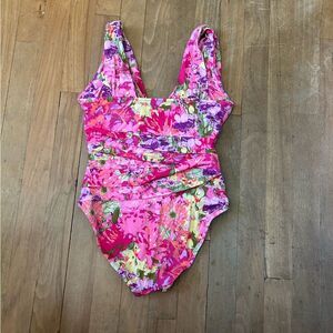•Pink floral v-neck wide straps one piece swimsuit with midsection ruching