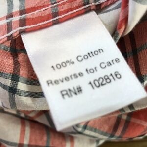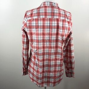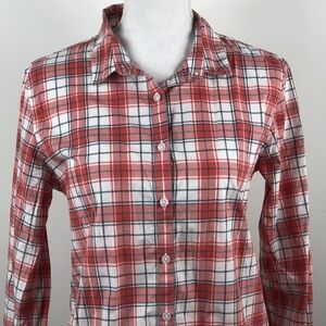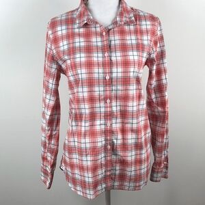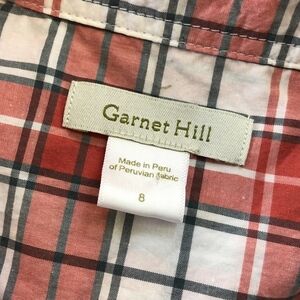 Orangey-red plaid button up shirt form Garnet Hill. 100% cotton mad win Peru. Gently used condition. Size 8. Measurements are approximate and taken when laid flat. Shoulders: 16" Armpit to Armpit: 20" Length: 28"