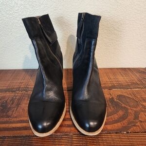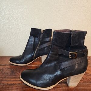 Garnet Hill Black Riley Boots. Genuine leather and suede. Buckled detail. Almond heeled toe.
