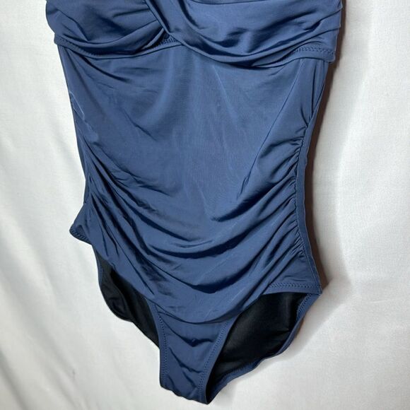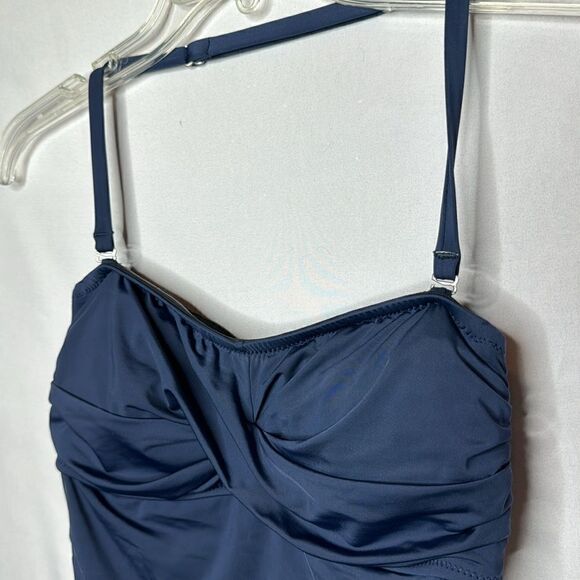 Garnet Hill Ruched Bandeau One Piece Navy bathing Suit. Size 4. NWOT. Ruching in front and side for slimming effect. Underwire. Removable adjustable strap. Solid navy color. New without tags. Never worn.