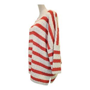 This sweater has a timeless, coastal vibe that's perfect for casual wear. It's being styled here with jeans for a classic, effortless look. The color combination of coral/rust and cream gives it a warm, earthy feel that would work well in fall or spring wardrobes. The relaxed fit makes it versatile for layering or wearing on its own.