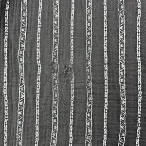 Features black ground with white lace-style vertical stripes, V neckline, peasant-style long sleeves with elastic cuffs.