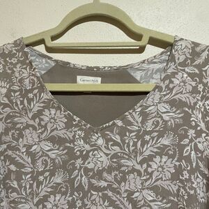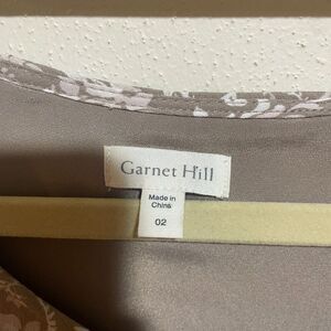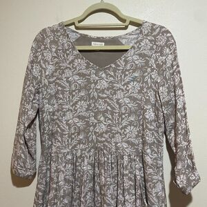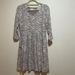 Garnet Hill Tan Floral V Neck 3/4 Sleeve Dress. V neck. Neutral tan beige color with floral pattern. Has pockets. 3/4 sleeves.