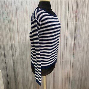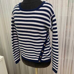 Garnet Hill Navy Blue & White Striped Sweater with decorative button detail. Size Small