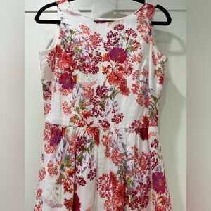 Bright floral cotton dress with sleeveless design. Side zipper closure.