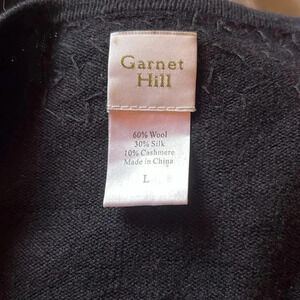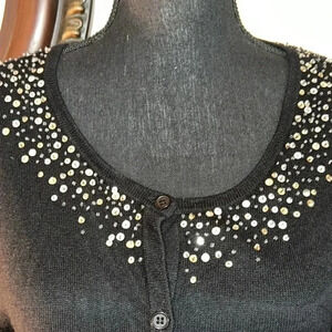 Garnet Hill Women’s Black Silk Cashmere Blend with hand sewn gold, silver and clear Sequins Collar 7 button closure Cardigan in GREAT condition! No holes or stains. Size: Large - Pls see measurements below as the sweater appears to be an XL. ***Styled on a size 4 mannequin***