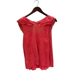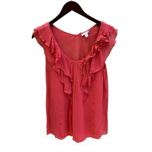 Garnet Hill women’s sleeveless blouse in a vibrant coral red. Features delicate ruffle trim along the neckline and front for a soft, feminine look. Made from a lightweight, semi-sheer fabric with a built-in matching cami for comfortable coverage. Flowy and flattering—perfect for warm days or layering. Gently worn, excellent condition. Size 10