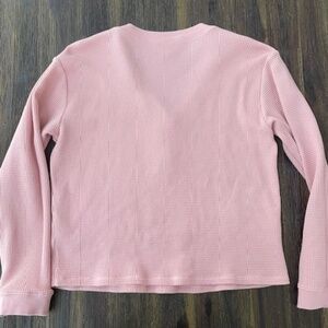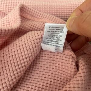 Very soft and cozy. Has a relaxed fit and hit at about the hip. Color is Rose Blush. No stains or holes, EUC