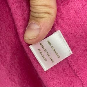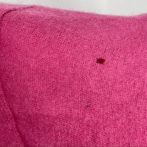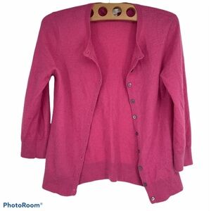 Bright pink three-quarter length sleeves little cashmere sweater from Garnet Hill. In perfect condition but for one small hole on the left shoulder. See last photo. Somebody who is handy could fix this easily. Super soft and lux. Pit to pit about 18 inches when buttoned