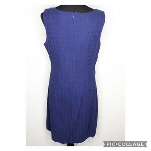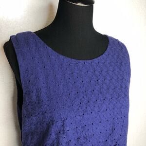 Garnet Hill navy blue lace eyelet sheath dress. Crew neckline. Sleeveless. Fully lined. Zips in back. Banded waistband. Back slit hemline. Size 14. Excellent pre-owned condition. 100% cotton. Machine wash.
