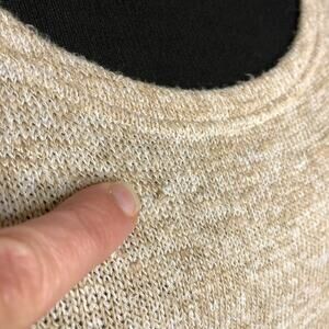 Garnet Hill tan cream marled sweater. Pullover style with scoop neckline. Long sleeves. Side slit hemline. Size extra large. Very good pre-owned condition. Some wash wear and a couple of tiny snags as shown. Rayon polyester spandex blend. Machine wash.
