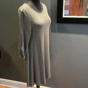 Garnet Hill marled gray stretch long tunic. A more modern version of one of your favorite all-time silhouettes, this laid-back tunic swings beautifully over anything you pair with it. The A-line style is relaxed enough for lounging about and polished enough for going out. Long enough to wear as mini/midi dress. Ruching at the cuffs of the three-quarter sleeves adds a romantic touch.