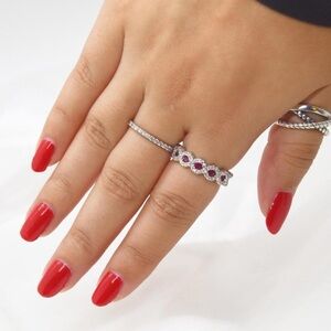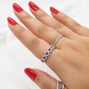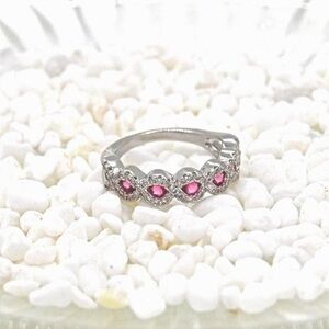 Elegant micro pave band featuring pink rhinestones and faux garnet accents. This stunning piece catches the light beautifully and adds brilliant sparkle!