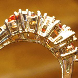 Stunning 9 marquise cut garnets with 10 round cut white sapphire prong set into 925 Silver. High polished finish. Tapered shank goes from approx. 7mm width under prong set stone area to 3mm width. Inner shank stamped "925" Lab created stones.