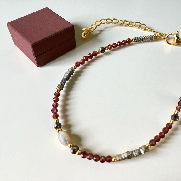 Gorgeous garnet and freshwater Pearl on 7” bracelet with adjustable links.