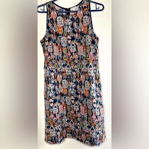 Embrace casual elegance with this Garnet Hill sheath dress, featuring a sleeveless design and a bateau neckline and side pockets. The dress showcases a captivating geometric print in brown and orange tones, perfect for resort wear. Its lightweight fabric and mini length offer comfort and style for warm weather outings. Gently worn. See photos for measurements.
