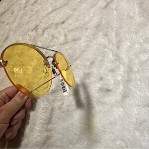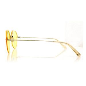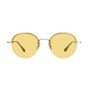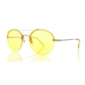 A large semi-rimless, round sunglass with pop lens colors and fine metal detailing, with new ultrathin temples and riveted hardware. Rimless stainless steel frame. Nylon lenses with UV protection and AR coating in Shooter Yellow. Clamp-on nosepads with adjustable metal arms. Three barrel hinges with real rivets.