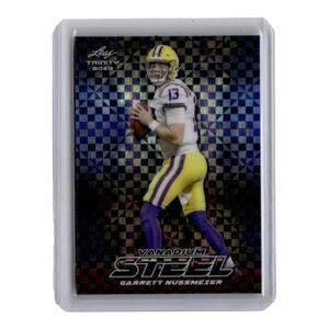 This Garrett Nussmeier football trading card is from the 2023 Leaf Trinity Steel Vanadium set. Featuring Nussmeier in his LSU Tigers uniform, this card is numbered 7/9, making it a rare and valuable addition for collectors. The card showcases a striking checkerboard pattern and metallic finish typical of the Vanadium parallel subset within the Steel series.