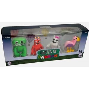 The "Garten Of BanBan Mini Collectible 4 Figure Set" features characters Banban and Banbaleena from the Banban franchise. Manufactured in 2024 by Phatmojo, the PVC/Plastic figures are multicolored and come in a hard plastic material. This 1st edition set is designed for ages 6 and up, with a TV, Movie & Video Games theme. Each figure represents a different character or design from the Banban series.