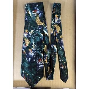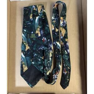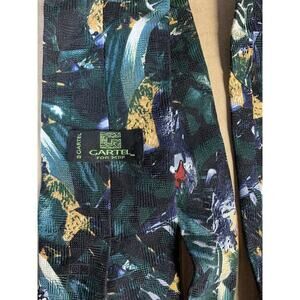 This pre-owned Garter Men's Tie in Green Forest features a Floral pattern, wide width, and classic length. The tie is vintage with a polyester material and a pretied style. It showcases characters like Captain Marvel, Buzz Lightyear, and Garfield, fitting themes of Nature, Animal, and Music. Perfect for fans of classic cartoons and nature enthusiasts.
