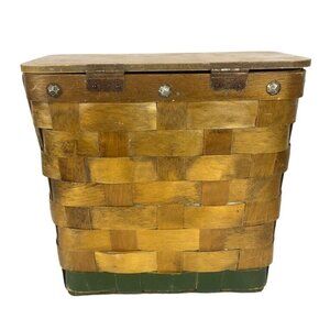 Vintage 1970s wood basket purse with a unique hand-painted cityscape design and quilted calico floral lining. Functional and charming collectible.
