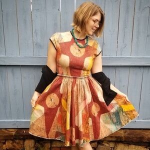 Wearable art, boho, hip, brown, caramel, summer, knee length, tea length dress, casual, work, fun, party, summer