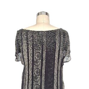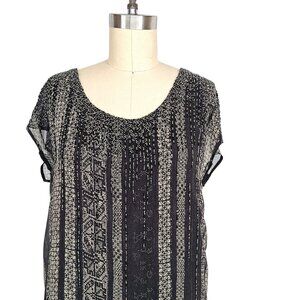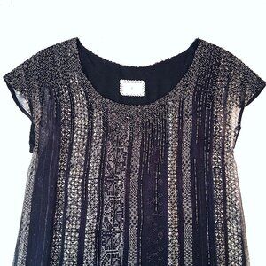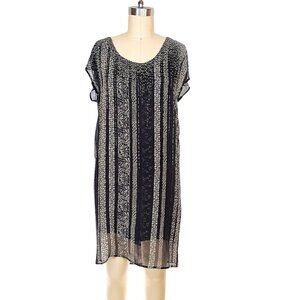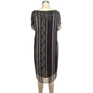 Gary Graham silk beaded shift dress in a creamy sage green and black mixed print. Sheer silk overlay with intricate glass beadwork cascading down the front, finished at varied lengths for texture and movement. Scoop neckline with short sleeves. Fully lined for wearability.