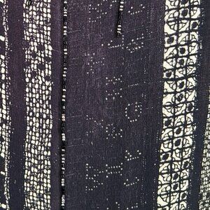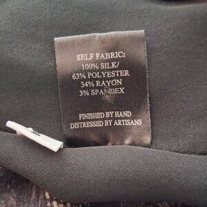 100% silk; lining 63% polyester, 34% rayon, 3% spandex. Finished by hand and distressed by artisans per designer label. Dry clean only.
