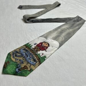 Multicolor tie features a cartoon art print of a golfer running into hunting bear traps while playing on the golf course. Vtg 1990s.