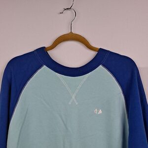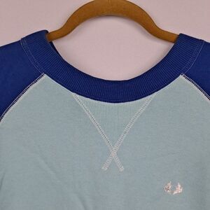 One side is light Teal, the other is royal blue, size medium. Crewneck pullover with long sleeves and pouch pocket front. Heavyweight French Terry. Measures 46" chest, length is 29". Retail $65